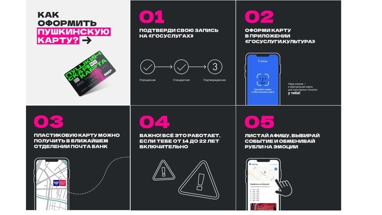 Пушкинская карта — это бесплатный доступ в мир искусства! Пушкинская карта — всероссийская программа, которая охватывает культурную сферу жизни людей в возрасте от 14 до 22 лет. В 2022 году на счету Пушкинской карты на каждую карту зачислено 5 000₽, из которых 2 000₽ можно потратить на приобретение билетов в кино на фильмы российского производства, либо всю сумму на музеи, театры и концертные залы.